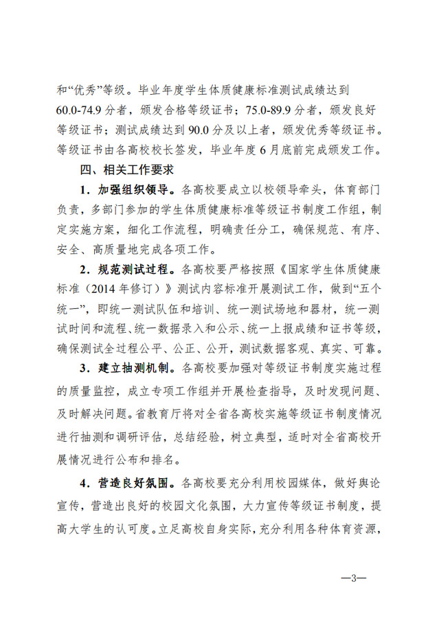 省教育厅关于在全省普通高等公司实施国家员工体质健康标准等级证书制度的通知