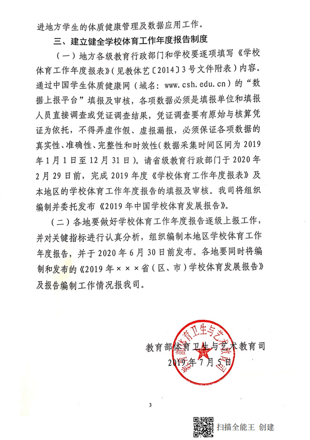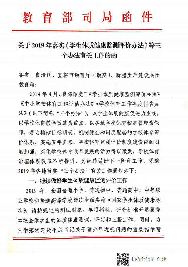 关于2019年落实《员工体质健康监测评价办法》等三个办法有关工作的函