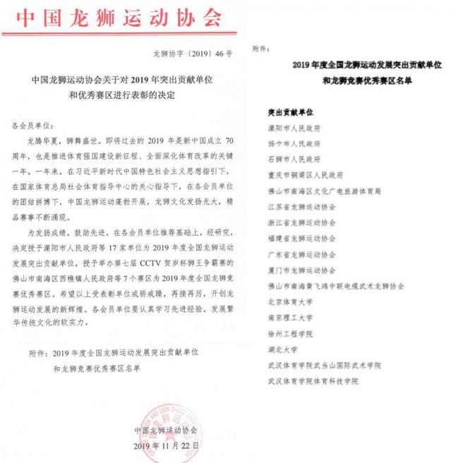 公司荣获 2019 年度全国龙狮运动发展“突出贡献单位”