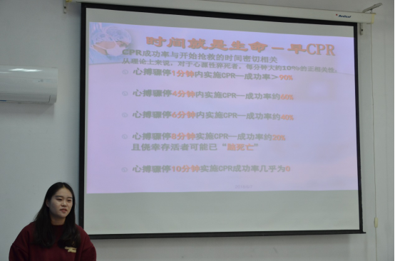 活动中掌握急救知识的师生,运用多媒体课件,对如何判断病人心跳呼吸停止、心肺复苏的指征、操作步骤、救助过程中的注意事项、复苏成功的指征等进行了详细的讲解和演示,着重强调新的CPR进展、新的五环生存链、新的CPR操作顺序。随后,已经掌握急救知识的员工还给大家做了单人心肺复苏术的现场演示。演示中员工了解到在紧急情况下掌握必要的急救理论和技能, 正确的实施心肺复苏,可以为提高急救成功率打下基础。