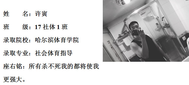 我始终以“用别人休息的时间来充实自己,以使自己保持足够的竞争力”这句话来激励自己,在学习之余我也积极参加学科竞赛与志愿活动,省第二届体育专业创新创业大赛以及校内知识竞赛,让我明白自己的局限,发现自己的不足,以及努力的方向,从而更高效的提升自我。在社会实践方面,我积极参加暑期“三下乡”社会实践,获得校级立项,并荣获市级暑期社会实践先进个人称号,这些活动丰富了我的生活,而生活丰富了我的青春,生命只给人一次青春,我选择追求,哪怕终被风浪淘汰,也无悔这段富有意义的旅程。