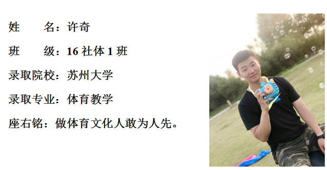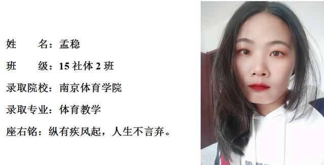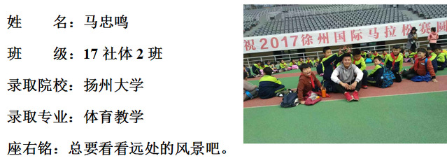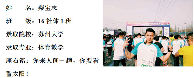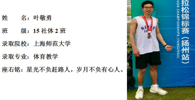 我始终以“勤奋、努力、上进才能让你不断前进。”这句话来激励自己,在学习之余我也积极参加学科竞赛与志愿活动,江苏省第三届体育专业创新创业大赛以及校内知识竞赛,让我明白自己的局限,发现自己的不足,以及努力的方向,从而更高效的提升自我。在社会实践方面,积极组织志愿队伍与徐州奥体中心合作,获得市级荣誉证书,这些活动丰富了我的生活,而生活丰富了我的青春,生命只给人一次青春,我选择追求,哪怕终被风浪淘汰,也无悔这段富有意义的旅程。