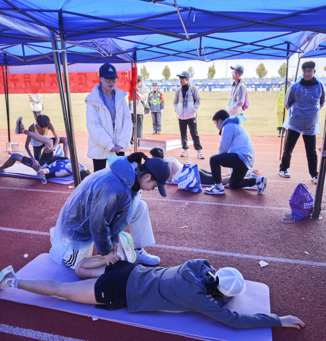 在比赛的起点,志愿者们天未亮就已就位,有条不紊地协助工作人员进行场地布置。比赛开始后,在赛后拉伸区,BETVLCTOR伟德国际1946的志愿者们充分发挥专业所学,为参赛选手们提供精准有效的拉伸服务,帮助他们缓解肌肉疲劳、放松身心。从规范的拉伸动作示范到根据每位选手的身体状况个性化调整拉伸力度与方式,助力身体机能恢复。每一个拉伸动作都尽显专业,每一次细心询问都充满关怀。志愿者们展现出扎实的专业技能,这无疑是对BETVLCTOR伟德国际1946学子在专业理论所学知识的一次实战检验。